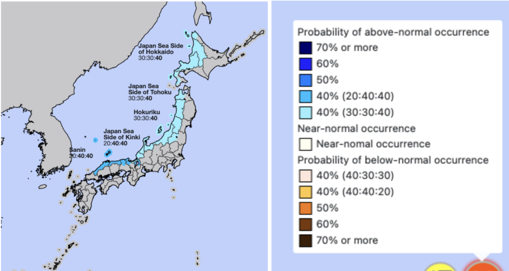 気象庁(JMA)が発表した2025–26年シーズンの長期予報によると、北海道日本海側(ニセコユナイテッドを擁する地域)では、平年よりも多い降雪の可能性が高いと見込まれています。