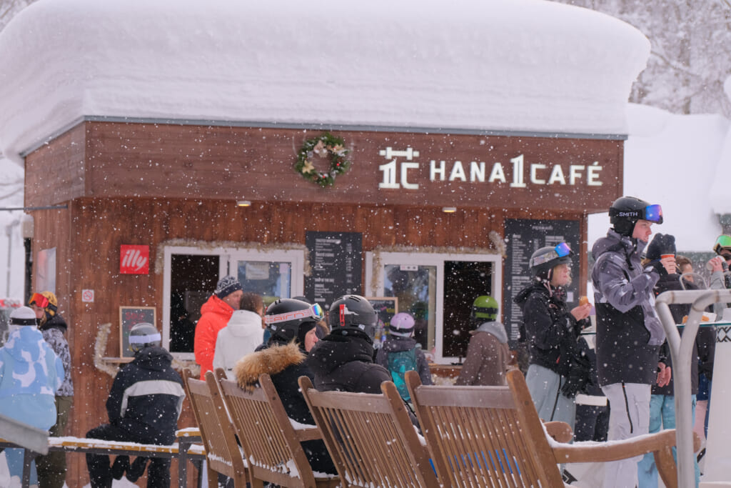 HANAZONO第1リフト乗り場のすぐ目の前にあるカフェで、ライディングの合間のちょっとしたブレイクに便利。軽食、スナック、自慢のエスプレッソコーヒーを気軽にお楽しみいただけます。